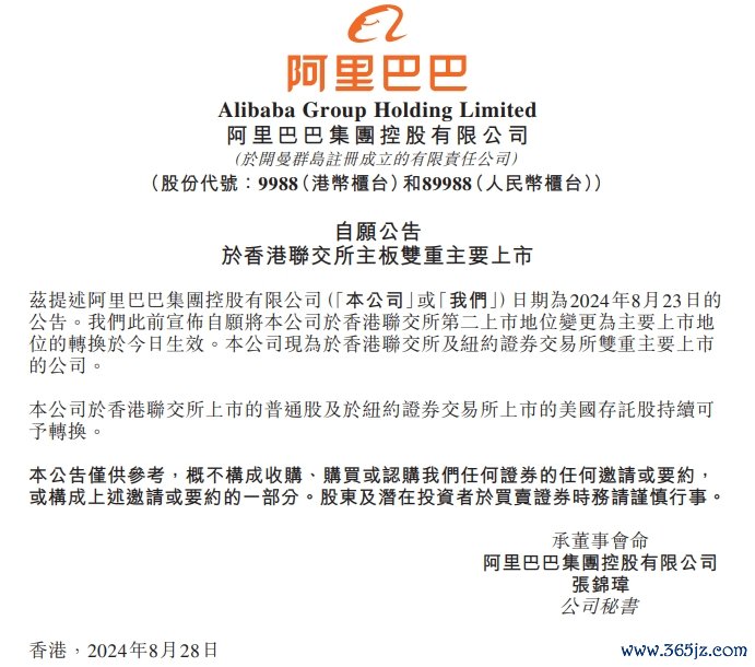 阿里巴巴:将公司于香港联交所第二上市地位变更为主要上市地位的转换于今日生效阿里巴巴:将公司于香港联交所第二上市地位变更为主要上市地位的转换于今日生效